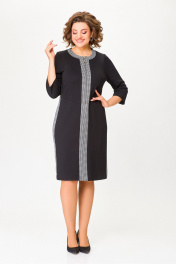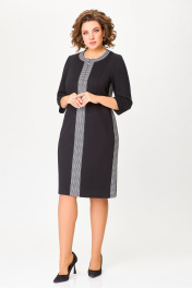 Платье полуприлегающего силуэта из эластичного трикотажного полотна. Спереди, по центру планка из декоративной ткани переходящая в отделку горловины. В верхней части планки металлическая молния, длиной 40 см. По бокам вставки из декоративной ткани. По спинке талиевые выточки, средний шов со шлицей. Горловина круглая, обработана обтачкой. Рукав одношовный, втачной, длиной ¾. Длина платья по спинке – 101(+/-1) см. Длина рукава – 48 (+/-1) см.