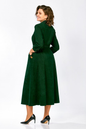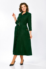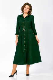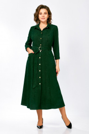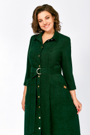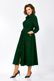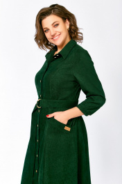 Платье из мягкой ткани вельвет, отрезное по линии талии с полуприлегающим лифом и юбкой А-силуэта, с центральной застёжкой на петли и декоративные пуговицы. Полочка лифа с вертикальными рельефами, спинка с кокеткой и отрезными бочками. Юбка состоит из семи клиньев. По переду между швами обработаны карманы с планкой на косую. Воротник отложной рубашечного типа, с отрезной стойкой. Рукав втачной, одношовный длиной ¾, внизу с манжетой, которая застёгивается на петлю и пуговицу. Платье комплектуется поясом из основной ткани, с декоративными полукольцами. На планке кармана фирменная декоративная эмблема «swallow». Длина рукава – 49 см. Длина платья по спинке – 124(+/- 1) см.