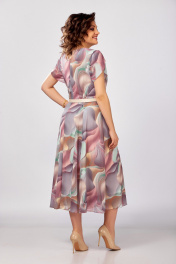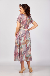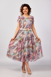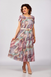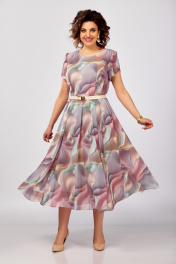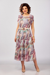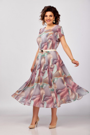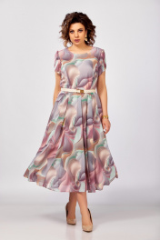 Платье из шифона на трикотажной подкладке, Х-образного силуэта с полуприлегающим лифом. Платье отрезное по линии талии. По переду лифа расположены рельефы, по спинке лифа талиевые выточки. Юбка расклешенная из шести клиньев со встречными складками по линии талии. В среднем шве спинки предусмотрена потайная тесьма- молния. Рукав втачной покроя тюльпан, длина рукава 15 см. В подарок ремень с декоративной пряжкой. Размер 64 комплектуется поясом из основной ткани. Длина изделия по спинке 120 см