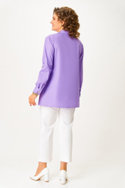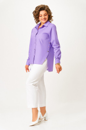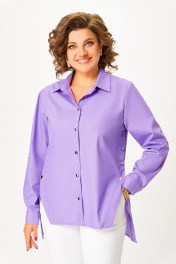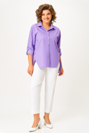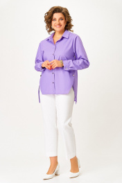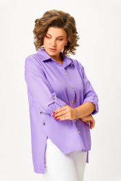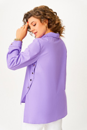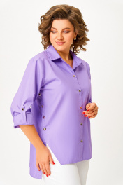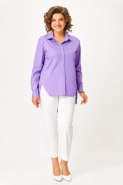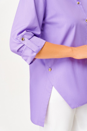Рубашка женская прямого силуэта с центральной застёжкой на петли и декоративные пуговицы, выполнена из хлопчатобумажной ткани. Боковые швы полочки и спинки имеют фигурную форму и соединяются между собой застёжкой на петли и декоративные пуговицы. Воротник рубашечный, отложной на стойке. Рукав втачной, одношовный, длинный с манжетой, которая застёгивается на петлю и пуговицу, и патой, которой регулируется длина рукава. Низ рубашки разноуровневый, полочка короче, спинка -длиннее. Длина по центру спинки – 75 (+/- 1) см. Длина рукава – 62 см.