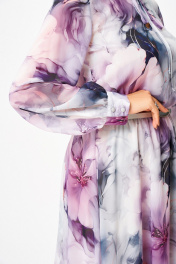 Платье из воздушной шифоновой ткани, на трикотажной подкладке, отрезное по линии талии, шов собран на эластичную тесьму-резинку. Горловина округлой формы, по переду капелька с завязкой. Рукав втачной одношовный, внизу со сборкой и манжетой, которая застёгивается на 2 петли и пуговицы. Юбка расклешённая. Подкладка лифа платья на бретелях. В подарок ремень с декоративной пряжкой. Длина рукава 63 см (+ /- 1 см) Длина платья по спинке 118 см (+ /- 2 см)