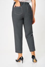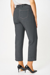 Брюки из мягкой эластичной ткани под джинс, прямого силуэта, заужены к низу. Спереди боковые функциональные карманы, сзади накладные фигурные карманы с двойной контрастной отстрочкой. Пояс притачной с эластичной тесьмой-резинкой по спинке и шлёвками для пояса. Застёжка на тесьму-молнию, петлю и джинсовую пуговицу на поясе. Длина по боковому шву без учёта ширины пояса- 91 (+/-1)см.
