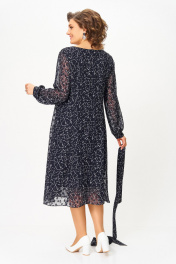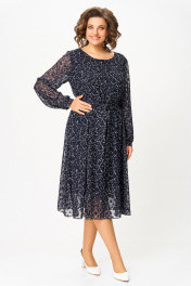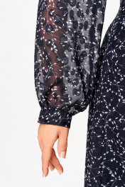 Платье полуприлегающего силуэта из фактурной шифоновой ткани с тиснёным узором на трикотажной подкладке. Полочка с отрезными рельефами, спинка с центральным швом и рельефами. Горловина округлой формы. Рукав втачной, длинный внизу со сборкой и манжетой, которая застёгивается на петлю и пуговицу. В центральном шве спинки застёжка на потайную тесьму-молнию. В комплете пояс из основной ткани. Длина платья по спинке: р.54,56,58 – 111(+/-2) см. р.60,62,64 – 114(+/-2) см. Длина рукава – 61 см.