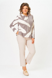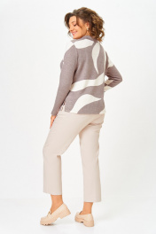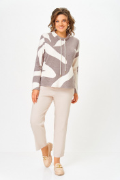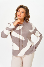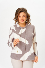 Джемпер из мягкого вискозного трикотажного полотна прямого силуэта, слегка расширен к низу. Перед и спинка цельные, в боковых швах разрезы длиной 11 см. Форма горловины круглая, обработана воротником-стойкой с люверсами, через которые втянут декоративный шнур с металлическими наконечниками. Рукав втачной одношовный длинный. Длина изделия по спинке в р. 50,52,54 – 58.5(+/-1) см. Р. 56,58,60 – 62(+/-1) см. Длина рукава - 60 см.