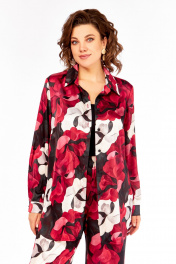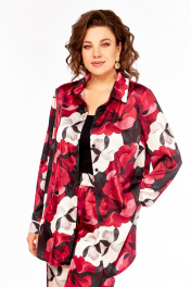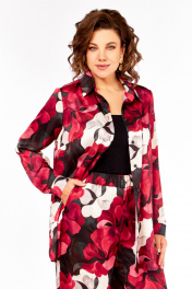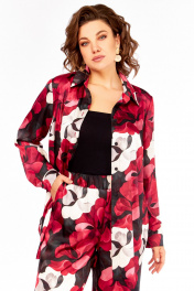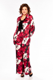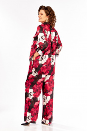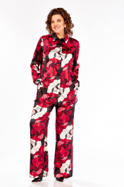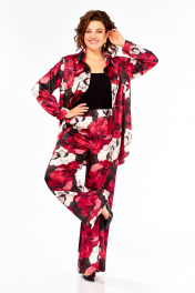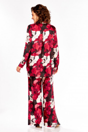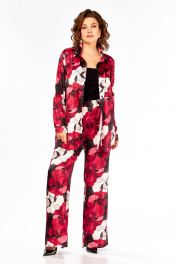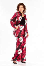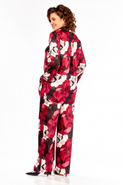 Костюм 2-х предметный, из легкой струящейся ткани «Армани» состоящий из блузки и брюк. Блузка прямого силуэта с центральной застёжкой на петли и декоративные пуговицы. По переду обработаны нагрудные вытачки, спинка с отрезной кокеткой, нижняя часть спинки с встречной складкой. Воротник рубашечного типа . Рукав втачной, одношовный длинный, с притачной манжетой, которая застёгивается на петлю и пуговицу. К рукаву пришита пата с пуговицей, которыми регулируется длина. Длина блузы по спинке 78 (+/-1) см. Длина рукава 61 (+/-1) см. Брюки прямого кроя. По передним половинкам боковые карманы наклонные к боковому шву . По задним половинкам брюк талиевые вытачки. Верх брюк обработан притачным поясом с эластичной тесьмой-резинкой. Длина брюк по боковому шву, без учёта ширины пояса – 107(+/- 1) см.