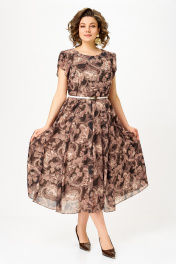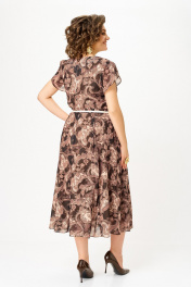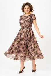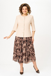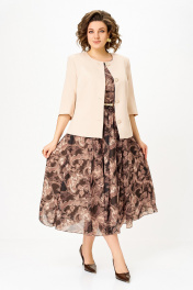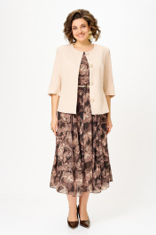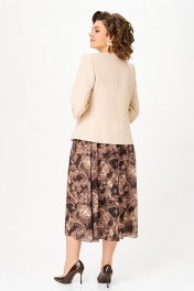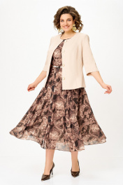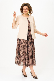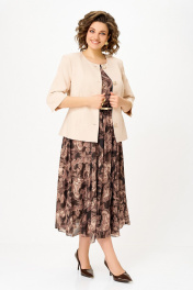 Комплект 2-х предметный, состоящий из жакета однотон из поливискозной ткани и платья в принт из нежного шифона мимоза. Жакет однобортный на подкладке. По переду рельефы и отрезные бочки, по спинке - рельефы и средний шов. Горловина круглая. Рукав втачной двухшовный, длиной ¾, внизу с разрезом. Застежка на 4 петли и 4 декоративные пуговицы. Длина жакета по спинке 60 (+/-1) см. Длина рукава 42 (+/-1) см. Платье из нежного шифона, Х-образного силуэта с полуприлегающим лифом. Платье отрезное по линии талии. По переду лифа расположены рельефы, по спинке лифа талиевые вытачки. Юбка расклешённая из шести клиньев со встречными складками по линии талии. В среднем шве спинки застёжка на потайную тесьму-молнию. Рукав втачной, покроя тюльпан, длина рукава 15 см. В комплекте ремень с декоративной пряжкой. !!! В 64р. в комплекте только съёмный пояс из основной ткани !!! . Длина платья по спинке 120 см