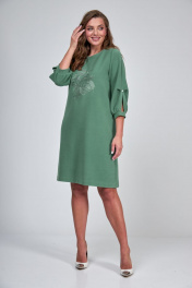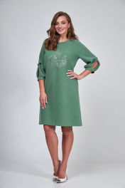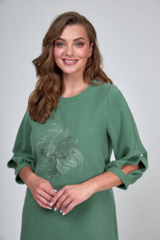 Платье женское, А образного силуэта с рукавом длиной 3/4 . Рукав фантазийной формы, к низу расширен и присобран на притачную манжету. По центру рукава шов, к низу переходящий в разрез. По шву мягкая складка, акцентированная пуговицей. Вырез горловины круглой формы с подрезной бейкой. Перед платья задекорирован оригинальной вышивкой с паетками. Спинка без особенностей. Длина по спинке 46р -91 см,48-52 р 94 см, 54-56 100 см.