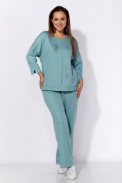 Комплект женский, 2х предметный, состоящий из джемпера и брюк. Джемпер прямого силуэта. Рукав со спущенной линией плеча, длиной 3/4. По низу рукава манжет с разрезом. По центру переда застрочен защип. По низу джемпера притачные планки, по бокам с разрезами. Перед задекорирован вышивкой с пайетками в тон изделия Брюки длинные, широкие-палаццо. Пояс цельнокроеный с резинкой.