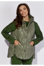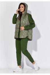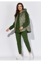 Комплект женский 3х предметный, состоящий из жилета, свитшота и брюк. Жилет чуть расширенный к низу. По переду смещенные к центру боковые швы, по низу переходящие в закругленные разрезы. От боковых швов наклонные карманы листочки Застежка по центру, однобортная на кнопки. Горловина оформлена капюшоном. Спинка без особенностей. Свитшот прямого силуэта с длинным втачным рукавом. Рукава по низу на манжете и задекорированы вышивкой шнуром с паетками. По переду фигурные рельефы с отделочной строчкой. Карманы в рельефах. Горловина круглая с подрезной бейкой. Спинка без особенностей. Брюки длинные, по низу на манжете. Спереди и сзади по брюкам диагональные подрезы с отделочной строчкой. Пояс притачной с резинкой по кругу.