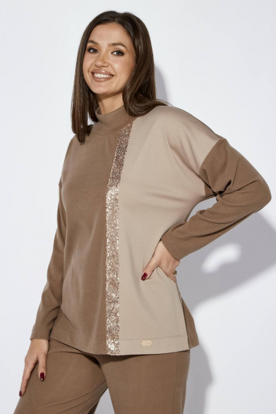 Комплект женский, 2х предметный, состоящий из джемпера и брюк. Джемпер прямого силуэта с длинным рукавом. Рукав со спущенной линией плеча. По переду ассиметричная, вертикальная вставка из отделочной ткани и полоски из паеток. Горловина оформлена мягкой стойкой. По бокам разрезы. По низу декоративная нашивка. Спинка без особенностей. Брюки прямые. По переду наклонные карманы. Пояс притачной, с резинкой по кругу.
