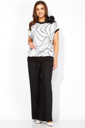 Комплект женский, 2х предметный, состоящий из блузки и брюк. Блузка прямого силуэта с коротким цельнокройным рукавом. По переду, от плеча, небольшая сборка. Горловина круглой формы. Низ рукава и горловина обработаны притачной бейкой. Снизу, по центру переда и спинки, сборка и притачная планка. Блузка на трикотажной подкладке.Верх блузки-трикотажная сетка. Декором служит съемный цветок. Брюки прямые. По переду мягкие складки и накладные карманы. Застежка спереди на тесьму "молния" под гульфик. Пояс притачной с резинкой от карманов по спинке. Застежка на петлю и пуговицу.