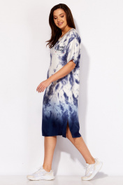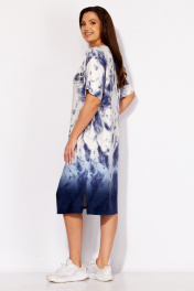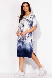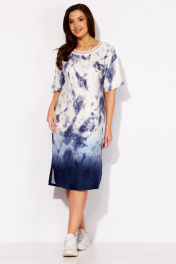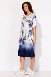 Платье женское, прямого силуэта с коротким рукавом. Рукав со спущенной линией плеча. Горловина круглой формы, по переду акцентирована трикотажным принтом. Перед платья, слева, задекорирован принтом. По бокам, снизу, разрезы. Спинка без особенностей.