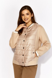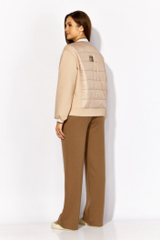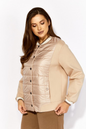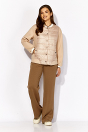 Комплект женский, 2х предметный, состоящий из куртки и брюк. Куртка выполнена на сочетании плотного трикотажного полотна и стеганой на синтепоне (VS-100) плащевки , частично на подкладке (стежка) Рукав длинный, со спущенной линией плеча, по низу на манжете (довяз). Центральная часть переда и спинки из стежки. Горловина круглой формы, оформлена довязом. Застежка центральная на кнопки. В рельефах, по переду, функциональные карманы, акцентированы декоративной кнопкой. На спинке отделочная нашивка. Низ куртки оформлен фигурной манжетой. Брюки прямые. По переду наклонные карманы. Пояс притачной с резинкой по кругу.