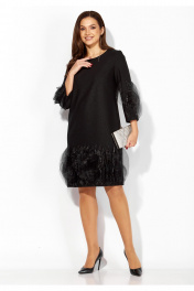 Платье женское, прямого силуэта, выполнено из ткани поливискоза "SHANE" со стрейчем. По переду нагрудные вытачки из пройм. Рукав втачной, длинной 3/4. Низ платья по переду и нижняя часть рукава задекорированы фантазийными элементами ткани из органзы. Вырез горловины круглой формы. По спинке шов и застежка на потайную тесьму "молния"