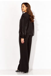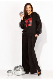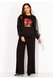 Комплект женский, 2х предметный, состоящий из джемпера и брюк, выполнен из трикотажного полотна"TENSEL" с отделкой органзой. Джемпер прямого силуэта с длинным рукавом. Рукав со спущенной линией плеча, двойной. Нижний-трикотажное полотно, верхний- объемный, со сборкой по окату и низу, из органзы. По низу манжета. Вырез горловины круглой формы с подрезной бейкой. По низу притачная планка с разрезами по бокам. Перед задекорирован ярким принтом. Брюки прямые, широкие. По переду отлетные наклонные складки, по низу с разрезами. От пояса мягкая складка. Карманы в боковых швах. Пояс притачной, с резинкой по кругу.