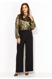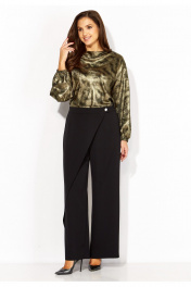 Брюки прямые, из текстильной ткани, с отлетной деталью по переду, закрепленной на отделочную кнопку. застежка брюк спереди на тесьму "молния" и петлю с пуговицей. Пояс отрезной, по переду гладкий, сзади на резинке.