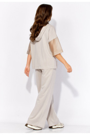 Комплект женский, 2х предметный, состоящий из блузы и брюк, выполнен из тонкого трикотажного полотна с отделкой из вуали. Блуза прямого силуэта с рукавом длинной до локтя. Рукав со спущенной линией плеча из отделочной ткани. По бокам узкие, подрезные бочки. Горловина оформлена капюшоном с кулисой. Перед задекорирован принтом. По спинке средний шов. Брюки прямые, широкие. По переду наклонные карманы. Пояс притачной, на резинке по кругу