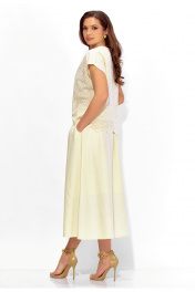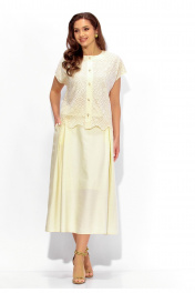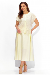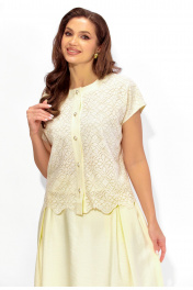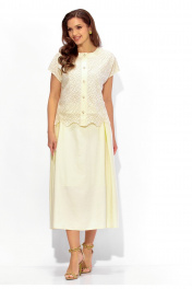 Комплект женский, 2х предметный, состоящий из блузки и юбки. Блузка выполнена из кружевного полотна, с отделочной тканью, на хлопковой подкладке. Блузка прямого силуэта, с цельнокройным коротким рукавом. Вырез горловины круглой формы с отделочной планкой. Застежка центральная, с планкой, на петли и пуговицы. Низ блузки фигурный. Юбка расширенная, из текстильной вискозной ткани, на хлопковой подкладке. По переду мягкие встрачные складки и наклонные карманы. Пояс притачной, по переду гладкий, сзади с резинкой. Комплект женский, 2х предметный, состоящий из блузки и юбки. Блузка выполнена из кружевного полотна, с отделочной тканью, на хлопковой подкладке. Блузка прямого силуэта, с цельнокройным коротким рукавом. Вырез горловины круглой формы с отделочной планкой. Застежка центральная, с планкой, на петли и пуговицы. Низ блузки фигурный. Юбка расширенная, из текстильной вискозной ткани, на хлопковой подкладке. По переду мягкие встрачные складки и наклонные карманы. Пояс притачной, по переду гладкий, сзади с резинкой.
