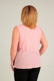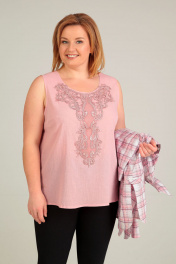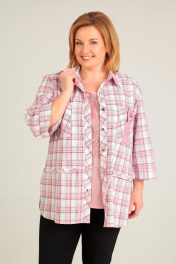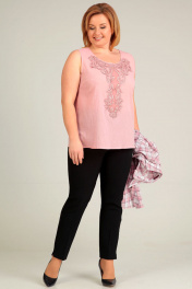 Комплект состоит из блузона свободного силуэта и прямого топа. Блузон с центральной застежкой на планку, втачным, рубашечным, на стойке воротником. Рукав одношовный, втачной, по низу рукава заутюживается заворот, который регулирует длину рукава. имеется кокетка спинки и полочки, настроченный нагрудные карманы. По линии ниже талии обработана кулиска. Топ с нагрудными вытачками, с разрезами по бокам, небольшим плечевым швом. Длина блузы по спинке 75-77 см, рукава 45 см. Длина топа сбоку блина спинки 61-63 см