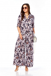 Стильный ,элегантный ,красивый , женский комплект из качественной ткани х/б,, состоит из брюк палаццо и блузона. Блузон со спущенной проймой , с воротничком и с пуговицами контрастного цвета , с карманами интересной формы , спускающимися к низу жакета Длина блузона по спинке от плеча 61,5 см . Брюки палаццо ,с хорошей посадкой . Спереди брючки со встречной складкой и функциональными карманами по бокам. Длина брюк 105 см Ткань костюмно плательная - Вискоза -100% . Рост модели 173 см