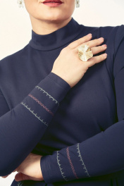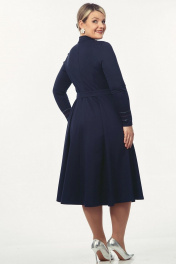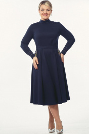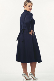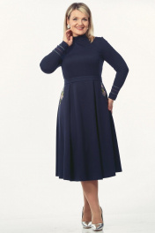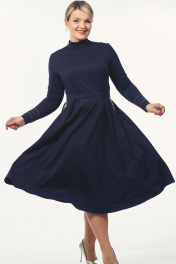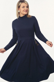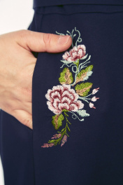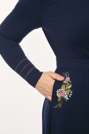 Платье трикотажное, отрезное по линии талии, прилегающее в верхней части, А-образное в нижней. Перед с талиевыми вытачками, горловиной-стойкой и односторонними складками в нижней части. В боковых швах – карманы. Вдоль карманов расположена вышивка. Спинка со средним швом, талиевыми вытачками и односторонними складками в нижней части. Рукав втачной одношовный с вышивкой по низу. К изделию прилагается съёмный пояс из основной ткани с металлической пряжкой и съёмная брошь. Длина платья: 118см. Длина рукава: 62см.