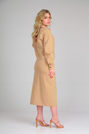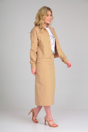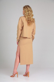 Костюм состоит из куртки и юбки. Куртка из тонкой джинсовой ткани без подкладки, прямого силуэта, со спущенной линией плеча, с отложным воротником, центральной застежкой на петли и пуговицы. Перед с накладными карманами. Спинка прямая с кокеткой. Рукав двухшовный втачной рубашечного типа, с притачной манжетой и застежкой на петли и пуговицы. Длина по спинке 52. Длина рукава 55. Юбка из тонкой джинсовой ткани четырехшовная, с карманами, гульфиком с застежкой-«молнией», на поясе с застежкой на петли и пуговицы. На левом полотнище скругленный подрез от середины бедра. Длина 80.