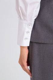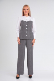 Костюм состоит из блузы и брюк. Блуза из костюмной ткани и ткани с хлопком, прилегающего силуэта, с центральной бортовой застежкой на петли и пуговицы. Перед с нагрудными и талиевыми вытачками, фигурным подрезом с воротником стойкой. Рукав втачной одношовный, с широкой манжетой с застежкой на петли и пуговицы. Длина по спинке 60. Длина рукава 64. Брюки из костюмной ткани свободного силуэта, с карманами в боковых швах, с гульфиком и застежкой «молнией», на поясе с резинкой и застежкой на петли-пуговицы. Длина 108. Фурнитура может отличаться.
