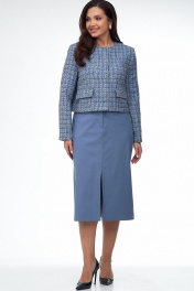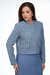 Жакет из ткани «Шанель» на подкладке, прямого силуэта, без воротника с центральной бортовой застежкой на пришивные кнопки. Перед с нагрудными вытачками и клапаном. Рукав втачной двухшовный. Вырез горловины круглый. Длина по спинке 50. Длина рукава 63.