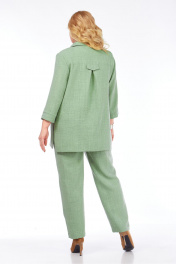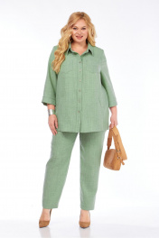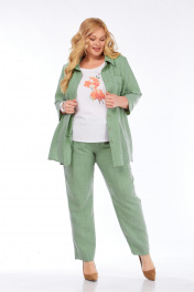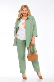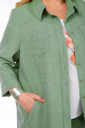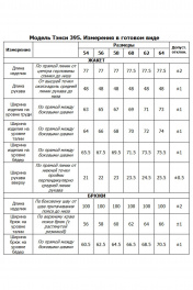Универсальный трёхпредметный комплект, состоящий из жакета-рубашки, брюк и блузы. Модель свободного кроя из лёгкой стрейчевой ткани с эффектом жатости, отлично подойдёт как для работы, так и для отдыха. Жакет, стилизованный под рубашку, прямого силуэта, с центральной застёжкой-планкой на восемь петель и пуговиц. На переде обработаны кокетки, нагрудные вытачки, накладные карманы, карманы с листочками. Спинка так же с кокеткой, встречной складкой и отделочным клапаном. Рукав втачной, длиной ниже локтя, по низу обработан манжетой. Низ жакета разноуровневый, в боковых швах обработаны разрезы. Горловина обработана рубашечным воротником с отрезной стойкой. Брюки на притачном поясе с резинкой и имитацией гульфика. Передние половинки с функциональными карманами. Лёгкая блуза с коротким рукавом. Перед с нагрудными вытачками и дизайнерским принтом. Горловина обработана окантовкой. В боковых швах обработаны разрезы. Отделкой комплекта служат металлическая фурнитура (может незначительно отличаться от представленной на фото) и оригинальный принт на блузе. Длина жакета от центра горловины спинки до низа: 77-77,5 см. Длина рукава: 48 см. Длина брюк по боковому шву (без учёта пояса): 100 см. Длина блузы от центра горловины спинки до низа: в 54-58 р-рах — 63см.; в 60-64 р-рах — 66см.