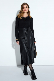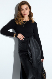 Модное платье полуприлегающего силуэта, комбинированное: верх из трикотажа в рубчик, низ из эко-кожи. Круглый вырез горловины, втачной длинный рукав, расклешенная юбка с высоким разрезом. Пояс съемный. Застежка на потайную молнию в боковом, без подкладки. Длина рукава 62 Длина 121
