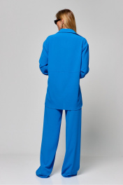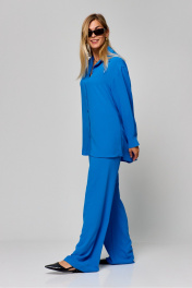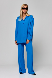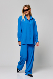 Комплект двухпредметный из рубашки и брюк.Прямые брюки василькового цвета придадут вашему образу яркий акцент , талия высокая, брюки на резинке , длина по боковому шву 110 см.Рубашка свободного кроя, воротник-стойка, по переду отстроченная планка с застежкой на петли-пуговицы . Длина рукава от линии шва – 57 см Ширина плеч – 51 см Длина изделия – 81 см