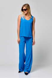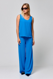 Комплект двухпредметный из топа и брюк .Брюки прямого кроя,талия высокая, брюки на резинке , длина по боковому шву 110 см.Топ прямого кроя без рукава на обтачке по переду и спинке .Длина по спинке 58 см , по груди в 42-м размере 44 см.