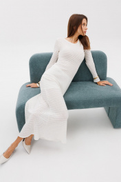 Платье макси выполнено из мягкого кружевного трикотажа премиум-качества в молочном цвете. Рукав втачной, платье прилегающего силуэта. В комплекте идет юбка на резинке. Данное платье можно сочетать с любой обувью, босоножки, сапоги, кеды, модель актуальна на любой сезон, в нем вы будете себя ощущать комфортно и стильно. Длина по спинке 144 см, длина рукава от линии плеча 63 см, полуобхват груди 43 см в 42-м размере