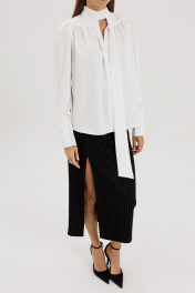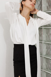 Блуза из атласа - тренд, котрый не выходит из моды. Блузу можно носить с джинсами, брюками, юбками. Блуза свободного кроя, горловина с воротником-стойкой, переходящей в бант, рукав притачной, манжета широкая, застежка на петли-пуговицы, по линии спины отрезная кокетка со сборкой. Низ блузки асимметричный. Рукав 66 см, по переду длина 63 см, по спинкеи длина 66 см .Рост модели на фото 178 см.