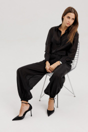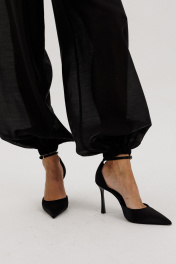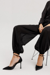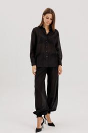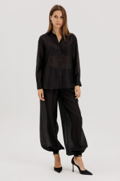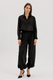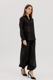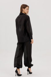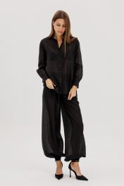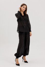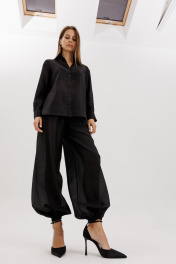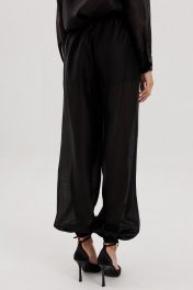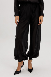Брюки-алладины свободного кроя выполнены из черной полупрозрачной ткани, к брюкам добавлены короткие шорты из хлопка, вшитые в пояс, талия на резинке, внизу манжета на резинке, что позволяет регулировать высоту брючины. Подойдет на праздник, на повседневный вариант, брюки можно носить с топом, рубашками, блузами. Обувь может быть абсолютно любая: спортивная, вьетнамки, классические туфли, босоножки. Длина изделия по боковому шву с манжетой - 106 см. Рост модели на фото 178 см.