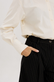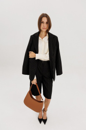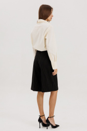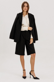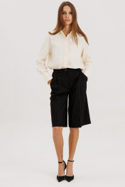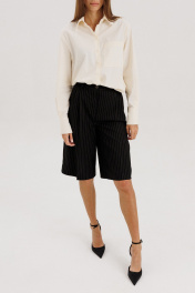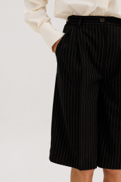 Классические шорты-бермуды на притачном поясе со шлевками, застежка на молнию и петлю-пуговицу. Выполнены из костюмной ткани черного цвета в полоску бежевого цвета. По переду защипы, высокая посадка, карманы боковые. Длина изделия 64 см, по талии 33 см в 42-м размере.Рост модели на фото 178 см.