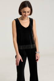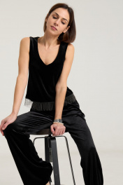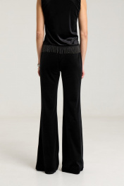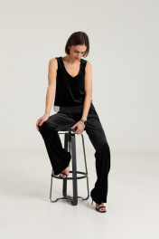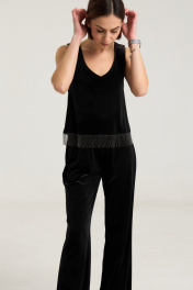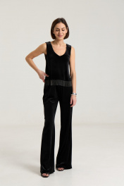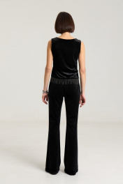Комплект из топа и брюк.Брюки расклешенные свободного кроя из велюровой ткани - это не только модель для праздника. Талия высокая, брюки на резинке , длина по боковому шву 108см.Топ свободного кроя выполнен из велюровой ткани черного цвета, на обтачке по переду и спинке, с углубленным вырезом. Длина по спинке 48 см, 6 см длина декора, полуобхват груди 43 см в 42-м размере. Рост модели на фото 168 см.