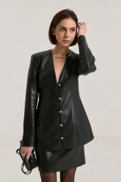 Комплект из жакета и юбки в черной экокоже.Жакет прилегающего силуэта с глубоким V-м вырезом, застежка центральная на навесные петли. Талия отрезная, полочка и спинка верхней части с выточками, нижняя часть полочки с выточками и рельефами. Жакет выполнен из мягкой экокожи черного цвета. Рукав втачной, двухшовный с плечевой накладкой. Жакет на подкладке. Длина по спинке -65 см, рукав 63 см, полуобхват груди - 43 см, плечо - 13 см в 42-м размере.Юбка прилегающего силуэта на притачном поясе, посадка высокая , юбка на подкладке.В среднем шве застежка на потайную молнию. Длина изделия 46 cм, полуобхват талии в 42-м размере 34 см
