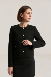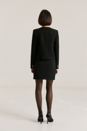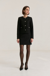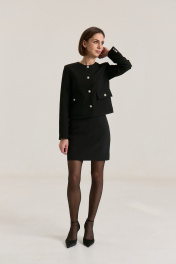Комплект двухпредметный, состоящий из жакета и юбки. Жакет из мягкой костюмной ткани укороченный, прямого силуэта, с втачными рукавами , горловина округлой формы, без воротника. Детали переда - нагрудными выточки, с настрочными листочками выше линии груди и на уровне талии. По бокам накладные функциональные карманы с застежкой на петлю-пуговицу. Застёжка жакета центральная однабортная на петли и пуговицы. спинка со средним швом и рельефами без шлиц и пуговиц. Жакет на подкладке. Юбка прилегающего силуэта на притачном поясе, посадка высокая , юбка на подкладке.В среднем шве застежка на потайную молнию, Жакет. Длина по спинке 50 см,Длина рукава 59 см . Юбка. Длина изделия 46 cм, полуобхват талии в 42-м размере 34 см.