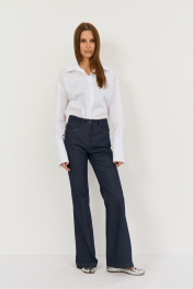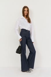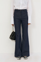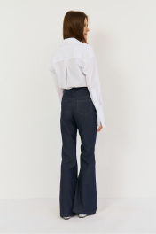 Классические расклешенные джинсы выполнены из легкой джинсовой ткани в темно-синем цвете, брюки прилегающего силуэта с высокой посадкой, пояс притачной со шлевками, застежка на молнию и кнопку. По переду расположены карманы. На задней половинке брюк отрезная кокетка и накладные карманы. Длина по боковому шву 108 см, полуобхват талии 35 см, полуобхват бедер 45 см , высота посадки 30 см в 42-м размере.