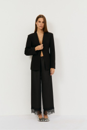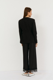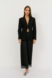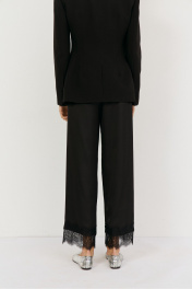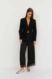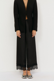 Прямые, укороченные брюки свободного кроя из атласной плотной ткани, талия на резинке , по низу отстроченные французским кружевом. Полуобхват талии - 33 см, полуобхват бедер - 50 см, длина по боковому шву с кружевом 90см.