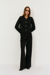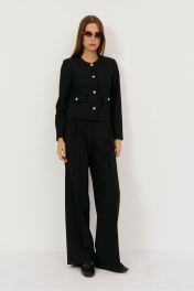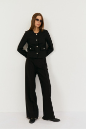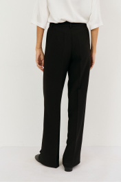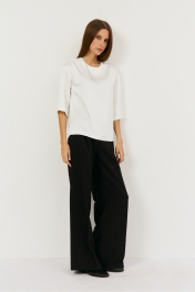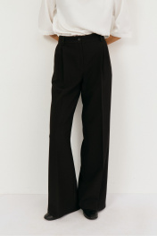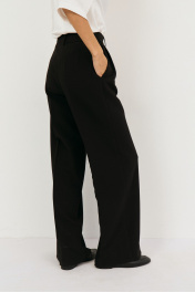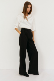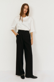 Брюки-палаццо прямые классические в черном цвете с боковыми карманами, спереди застежка- молния, по переду защипы. Брюки выполнены из ткани костюмной группы.Верх брюк обработан притачным поясом со шлевками. Данная модель делает фигуру стройнее и зрительно удлиняет ноги. Длина по боковому шву 110 см, полуобхват талии - 33см, полуобхват бедер - 49 см.