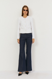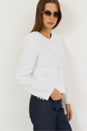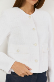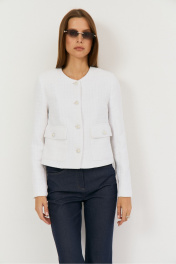 Жакет из твида в белом цвете, жакет прямого силуэта, на подкладке, с центральной застежкой на 4 петли и пуговицы . Жакет может быть как нарядным, так и повседневным. Перед с нагрудными вытачками, идущими от боковых швов, в нижних частях с прорезными функциональными карманами с клапанами . Клапан застегивается на 1 петлю и пуговицу. Спинка со средним швом. Рукава втачные, двухшовные. Горловина круглой формы, обтачная. Жакет с плечевыми накладками. Длина по спинке 50см, Длина рукава 61 см
