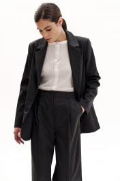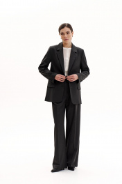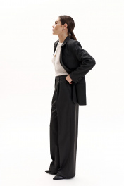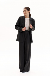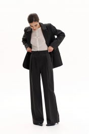 Костюм-двойка из свободного жакета со шлицей и брюк-палаццо с высокой посадкой.Жакет прямого силуэта на подкладке. Воротник пиджачного типа с лацканами. Плечевой шов умеренно расширен. Края бортов с закруглением. Вытачки по переду уведены под лацкан, застежка центральная на две пуговицы, функциональные карманы с клапанами. Спинка прямая, без вытачек, со средним швом, со шлицей. Рукав жакета втачной, двухшовный, со шлицей. Рукав имеет 4 декоративные пуговицы.Брюки-палаццо со стрелками с высокой посадкой. Пояс со шлевками, застежка на молнию и пуговицу, боковые карманы. Задняя часть с вытачками, без карманов.