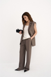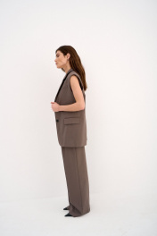 Жилет женский, свободного кроя с отложным воротником на отрезной стойке и лацканами классической формы. Выполнен из полушерсяной ткани. На подкладке из поливискозы. Однобортный, с легким закруглением по низу борта. С объемными подплечниками. Застёгивается до перегиба лацкана на две пуговицы. По среднему шву спинки отлетная шлица. Имеет два прорезных кармана в рамку с клапаном. Слева по переду, выше уровня груди имитация кармана с листочкой. Длина жилета по спинке 76 см во всех размерах. Полуобхват по линии груди - 53, 55, 57, 59см в размерах 42,44,46,48. Полуобхват по линии бедер - 54,5, 56,5, 58,5, 60,5 см в размерах 42,44,46,48.