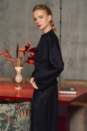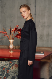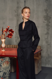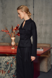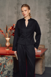 Жакет полуприлегающего силуэта в азиатском стиле. Длина выше линии бедер, изделие на подкладке. По переду от линии плеча до низа изделия вертикальный рельеф. Застежка на навесные петли и три пуговицы. Спинка со средним швом и вертикальными рельефами от плечевого шва до низа изделия. Аккуратная V-образная горловина. Воротник стойка, края воротника закруглены и наклонены по диагонали. Спущенная линия плеча. Рукава рубашечного кроя, без манжет. по спинке - 53,5-54,5 см.