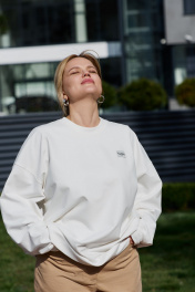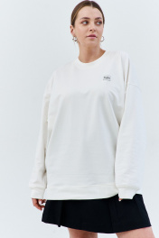 Свитшот женский оверсайз силуэта, удлиненный. Спущенная линия плеча добавляет комфортности в эксплуатации. Слева по переду нашита лейба с названием бренда.Ширина по бедрам -65
