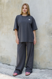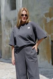 Брюки прямые палаццо, из трикотажа с хлопком, смодным вываренным эффектом. Брюки с верху на эластичной тесьме, и имитацией застежки по переду. По бокам карманы в швах. Пояс декорирован лейбой с названием бренда Футболка женская, оверсайз силуэта из хлопкового трикотажа с вываренным модным эффектом. Футболка удлиненная , с коротким рукавом ниже локтя. Горловина с обработкой по внутреннему срезу по спинке хлопковой тесьмой нежно -розвого цвета Слева по переда нашита лейба с названием бренда. Интересное оформление горловины в спортивном стиле -по переду симметричный уголок