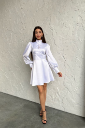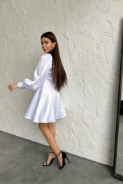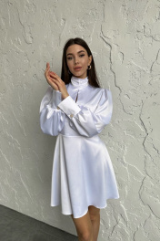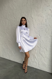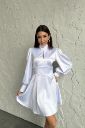 Платье из плотного атласа с вырезом по груди и закрытой спинкой . Рост модели 169 см. Длинна по спинке 90 см, длинна рукава 66 см