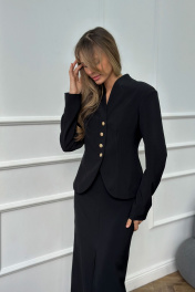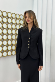 Жакет приталенного силуэта с закругленными краями и акцентными пуговицами Рост модели 176 см. Длина -58 см, рукав -61 см ,обхват груди -92 см , обхват талии-78 см